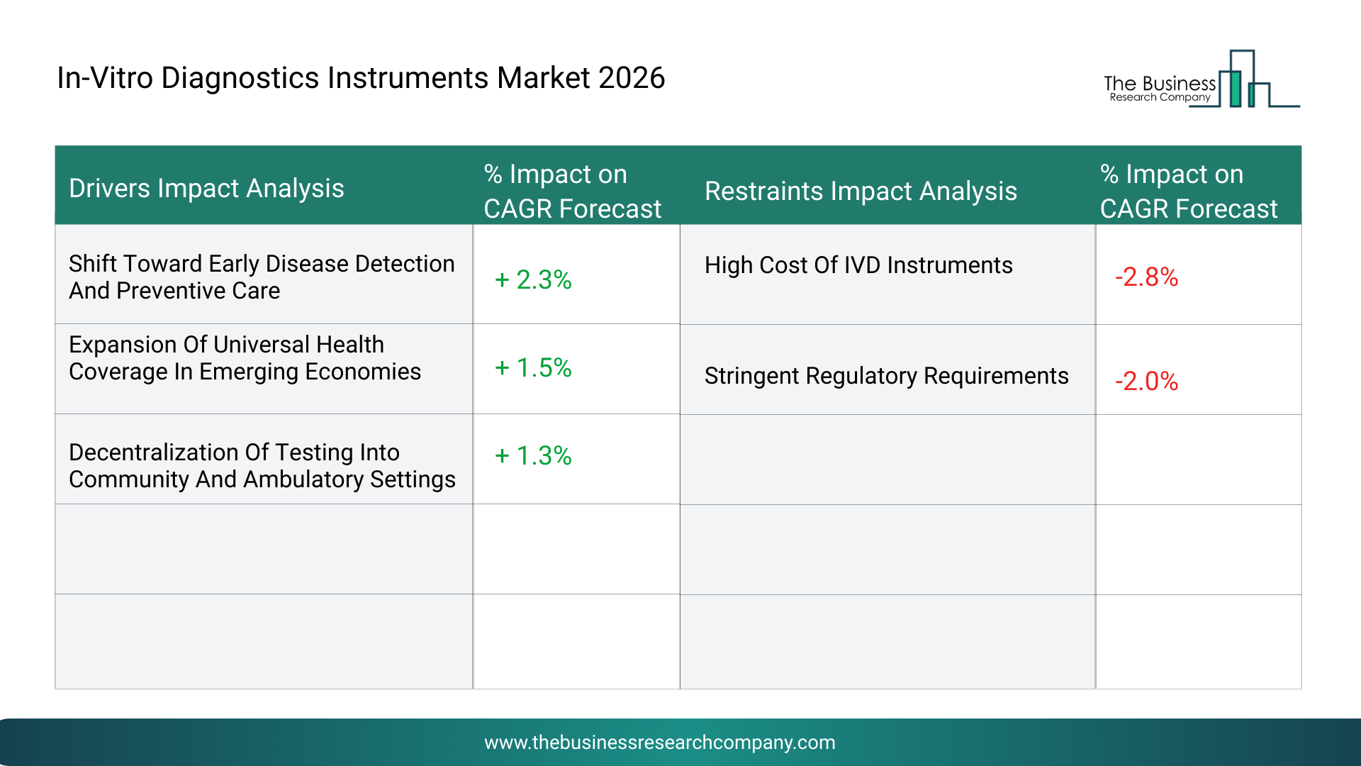 Expansion Of Universal Health Coverage In Emerging Economies - The expansion of universal health coverage across emerging economies is expected to significantly support the growth of the in-vitro diagnostics instruments market. Governments are increasing healthcare spending and investing in diagnostic infrastructure to improve access to essential testing services. Broader insurance coverage and national screening initiatives are driving demand for automated analyzers, molecular diagnostic systems, and cost-effective point-of-care devices. As healthcare accessibility improves in developing regions, diagnostic volumes are expected to rise substantially, contributing around 1.5% annual growth to the market.